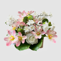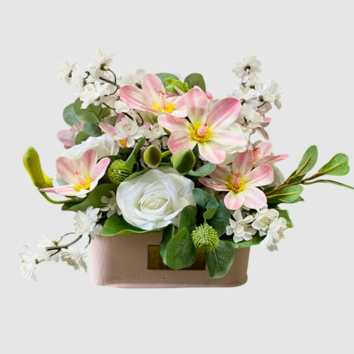 گل ارکیده و رز مصنوعی همراه باکس روکش دار صورتی