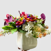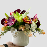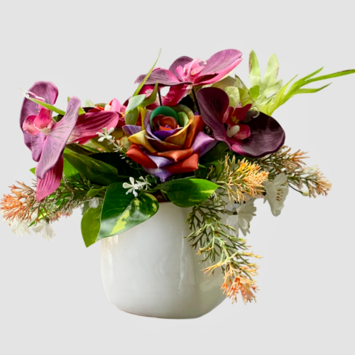 گل ارکیده بنفش و رز ۷رنگ مصنوعی ترکیبی همراه گلدان سرامیکی