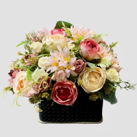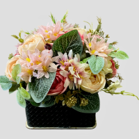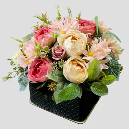 گل زر گلبهی و صورتی مصنوعی تریکیبی همراه جعبه چوبی روکش دار