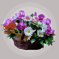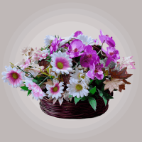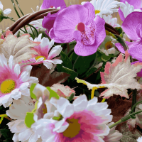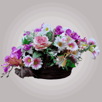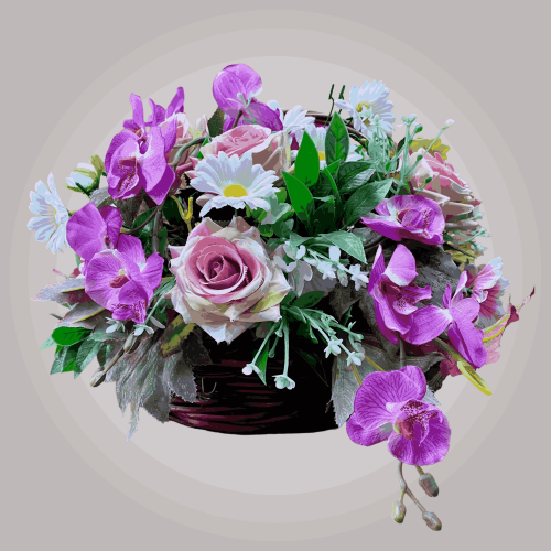 گل ارکیده بنفش و رز صورتی مصنوعی همراه سبد چوبی دسته دار